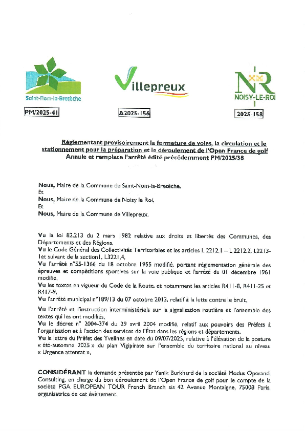 Dans le cadre de l’Open de France de golf, qui se déroulera du 15 au 22 septembre 2025, un arrêté municipal conjoint a été pris par les communes de Saint-Nom-la-Bretèche, Noisy-le-Roi et Villepreux.