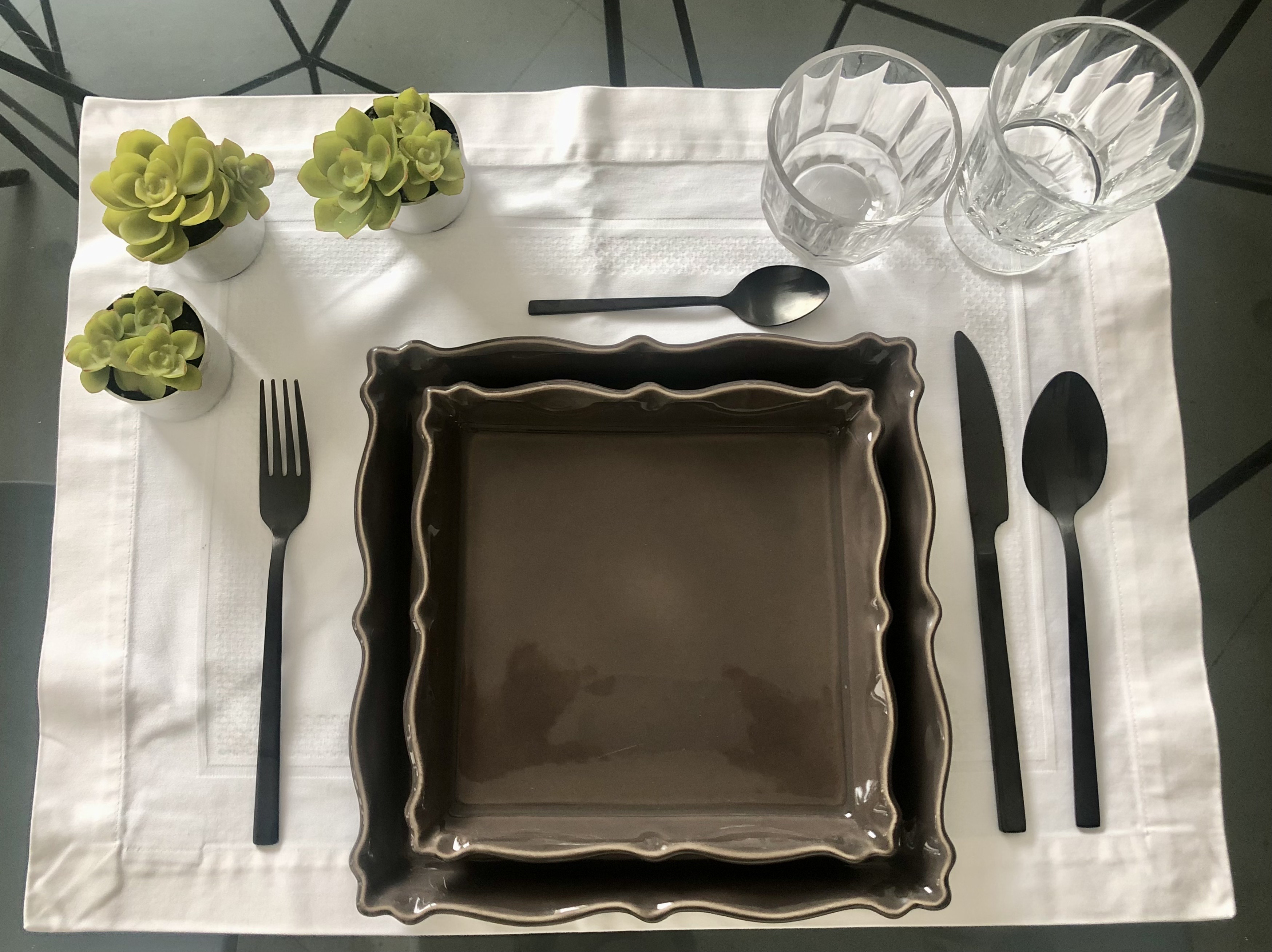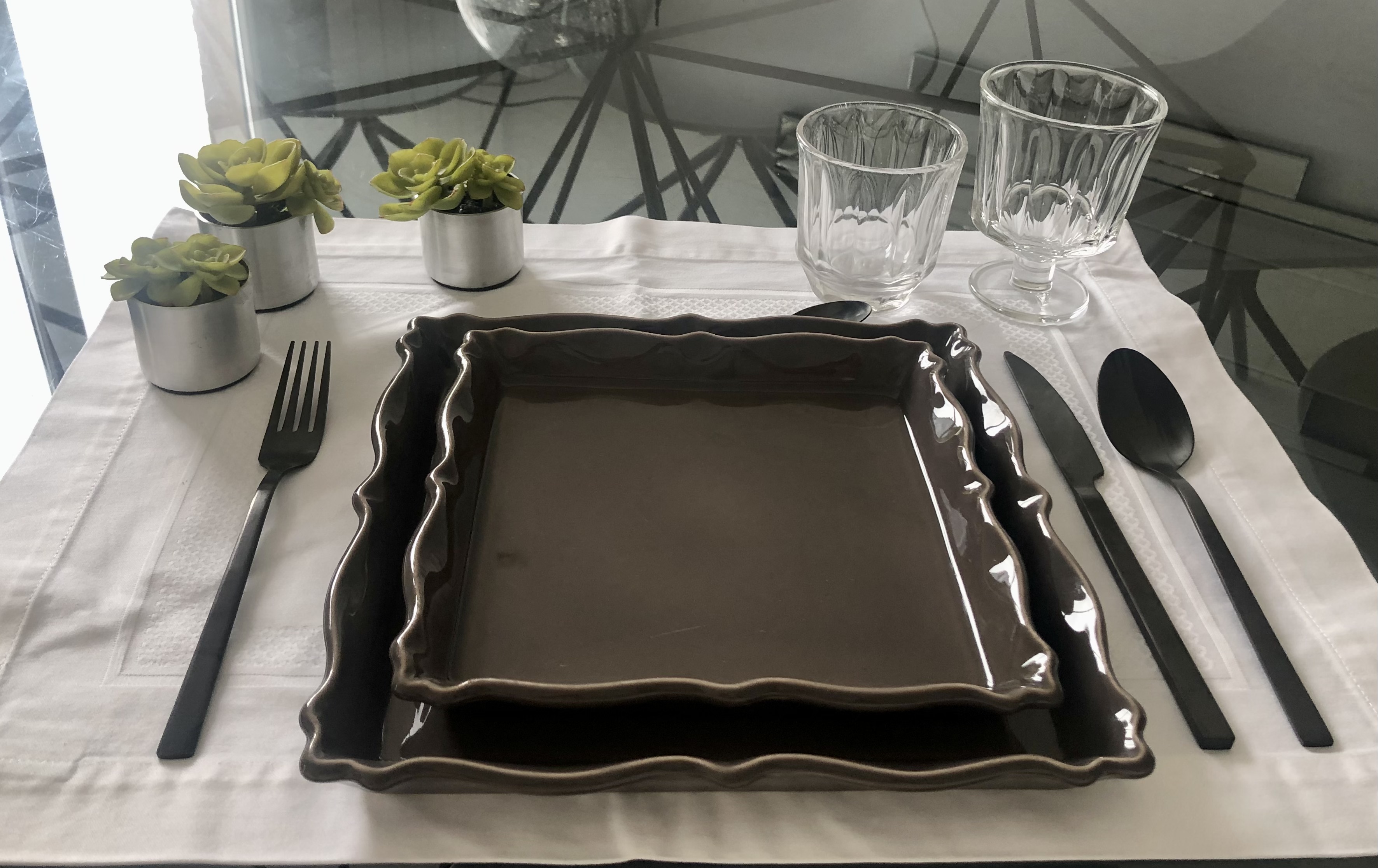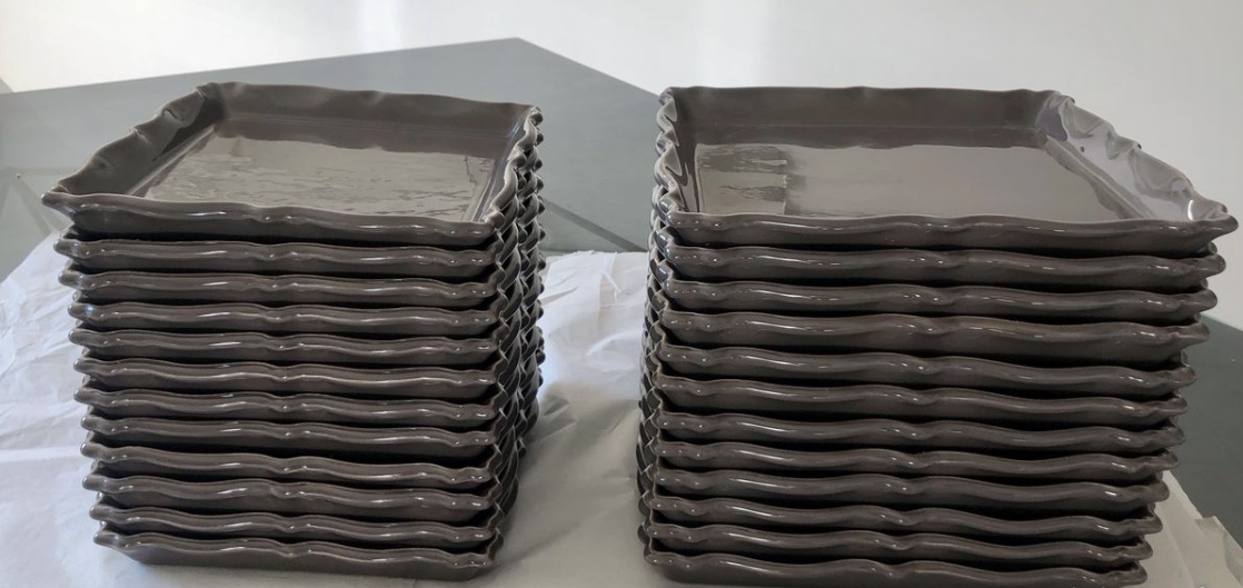 Assiettes, plats en céramique grès taupe.